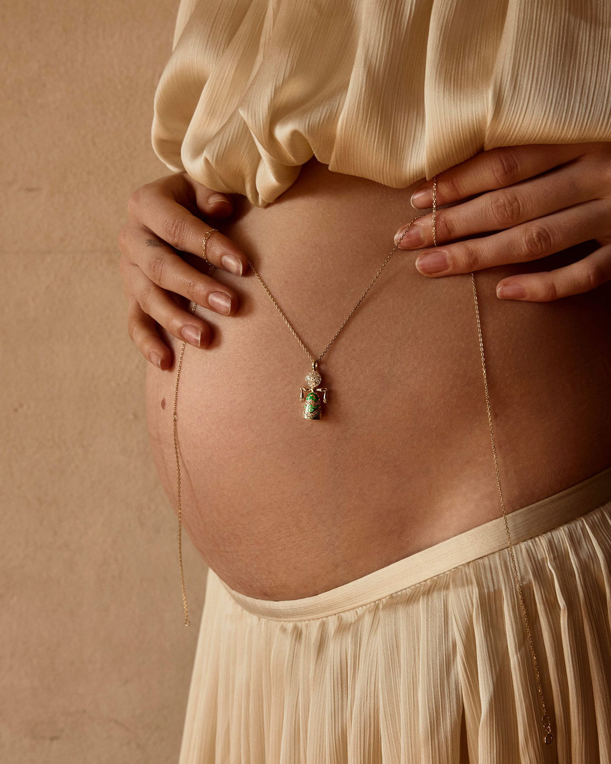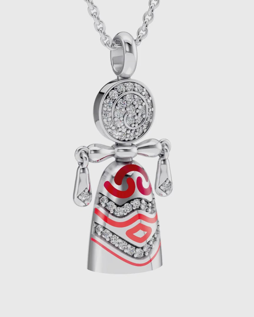 Підвіска лялька-мотанка "Кольори роду" — це прикраса, яка втілює глибинний зв’язок між поколіннями та спадщиною вашого роду. Виготовлена з золота 585 проби, інкрустована діамантами та ювелірною емаллю, ця підвіска є символом родинної сили та мудрості, що передається через покоління.