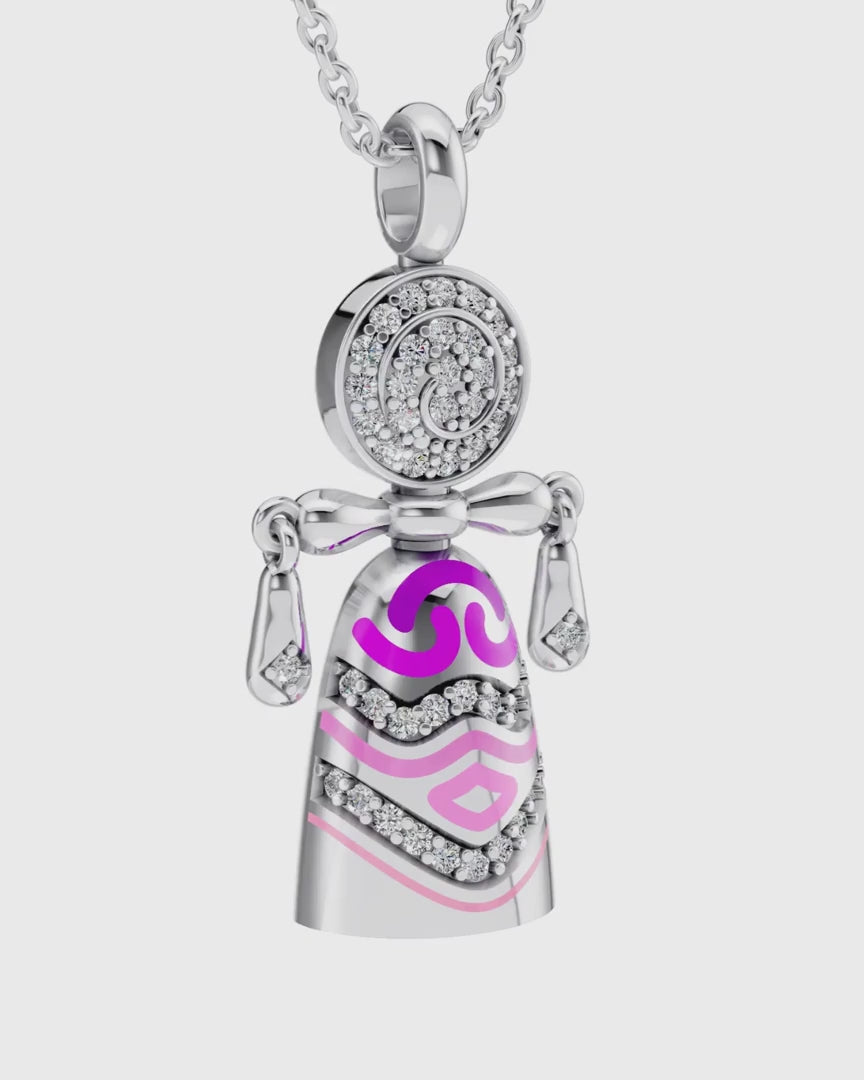 Підвіска лялька-мотанка "Кольори роду" — це прикраса, яка втілює глибинний зв’язок між поколіннями та спадщиною вашого роду. Виготовлена з золота 585 проби, інкрустована діамантами та ювелірною емаллю, ця підвіска є символом родинної сили та мудрості, що передається через покоління.