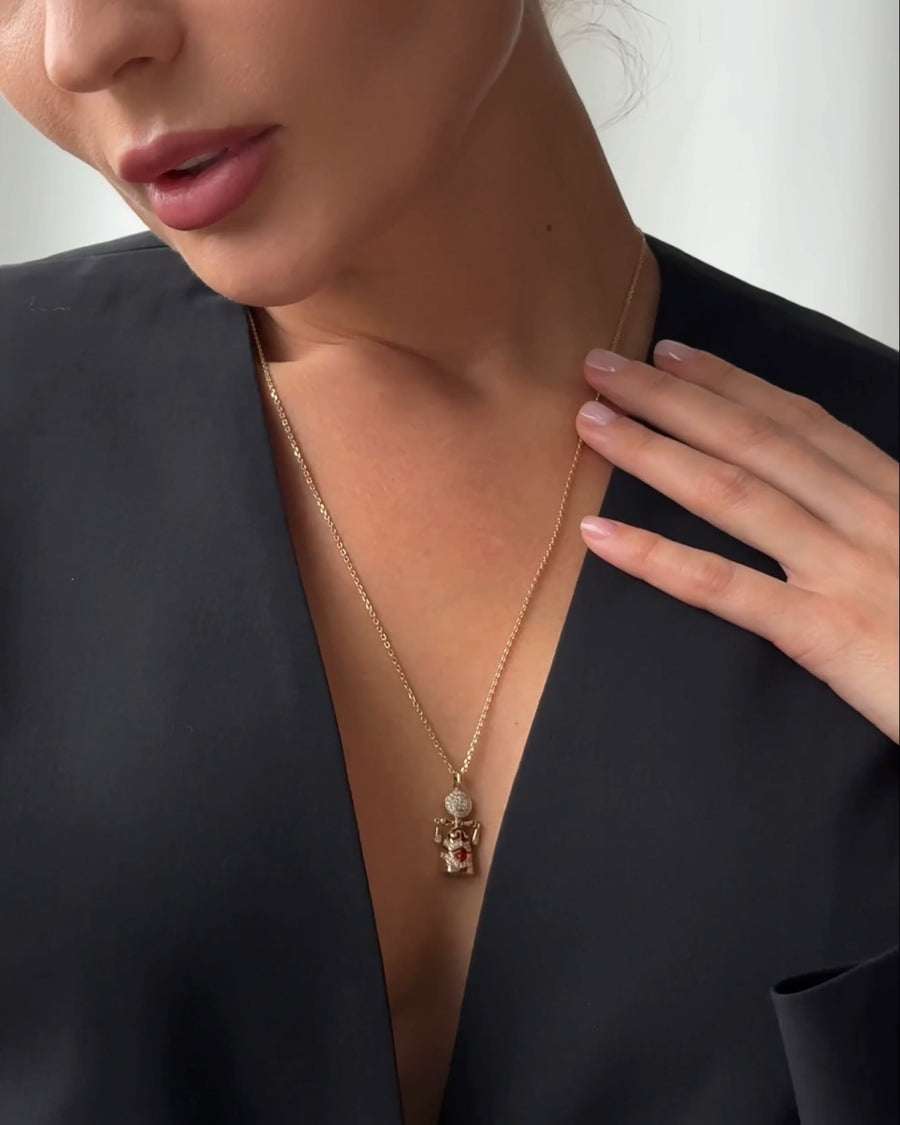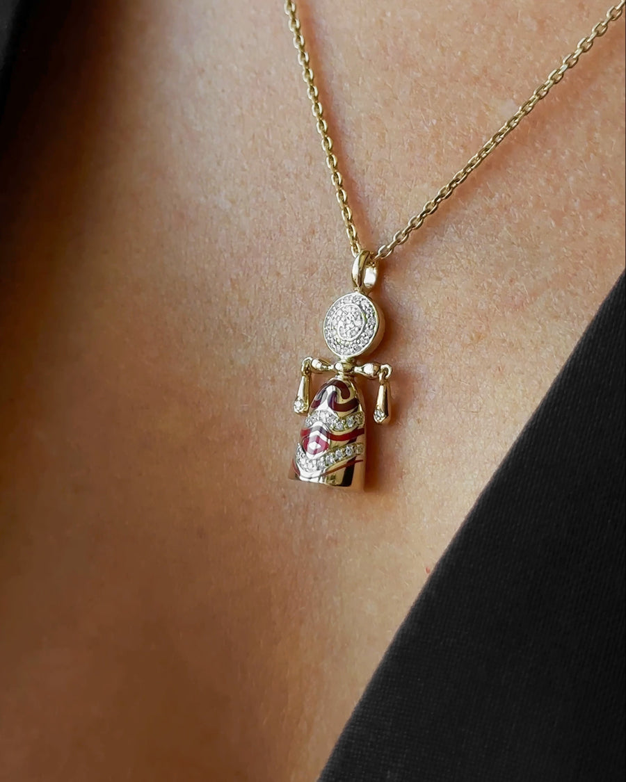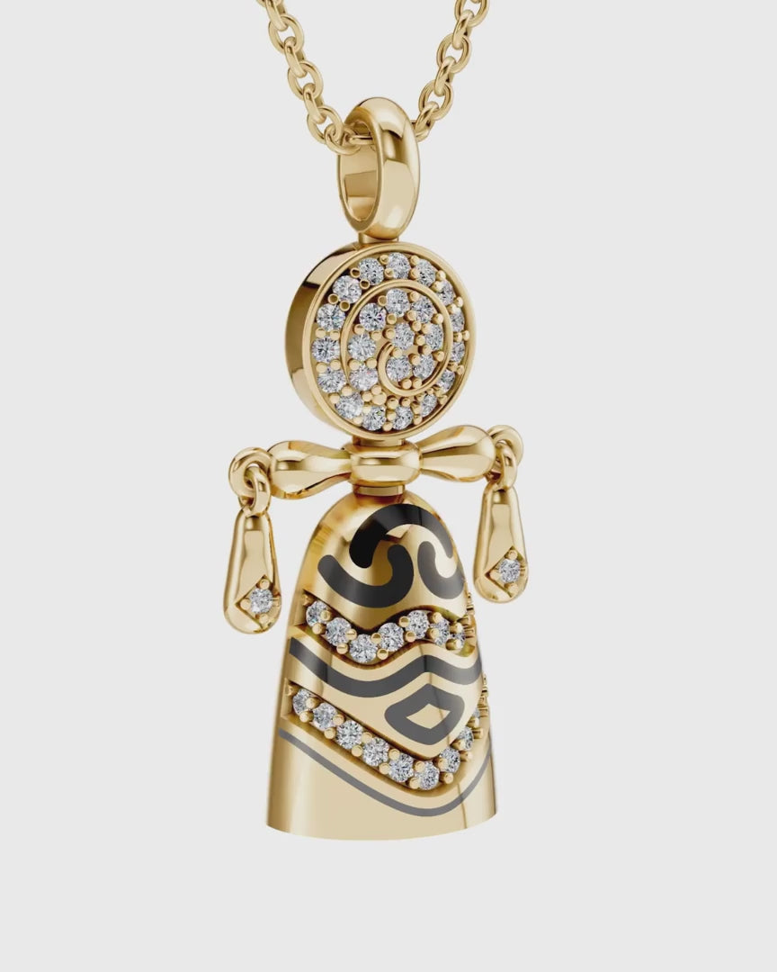 Підвіска лялька-мотанка "Кольори роду" — це прикраса, яка втілює глибинний зв’язок між поколіннями та спадщиною вашого роду. Виготовлена з золота 585 проби, інкрустована діамантами та ювелірною емаллю, ця підвіска є символом родинної сили та мудрості, що передається через покоління.