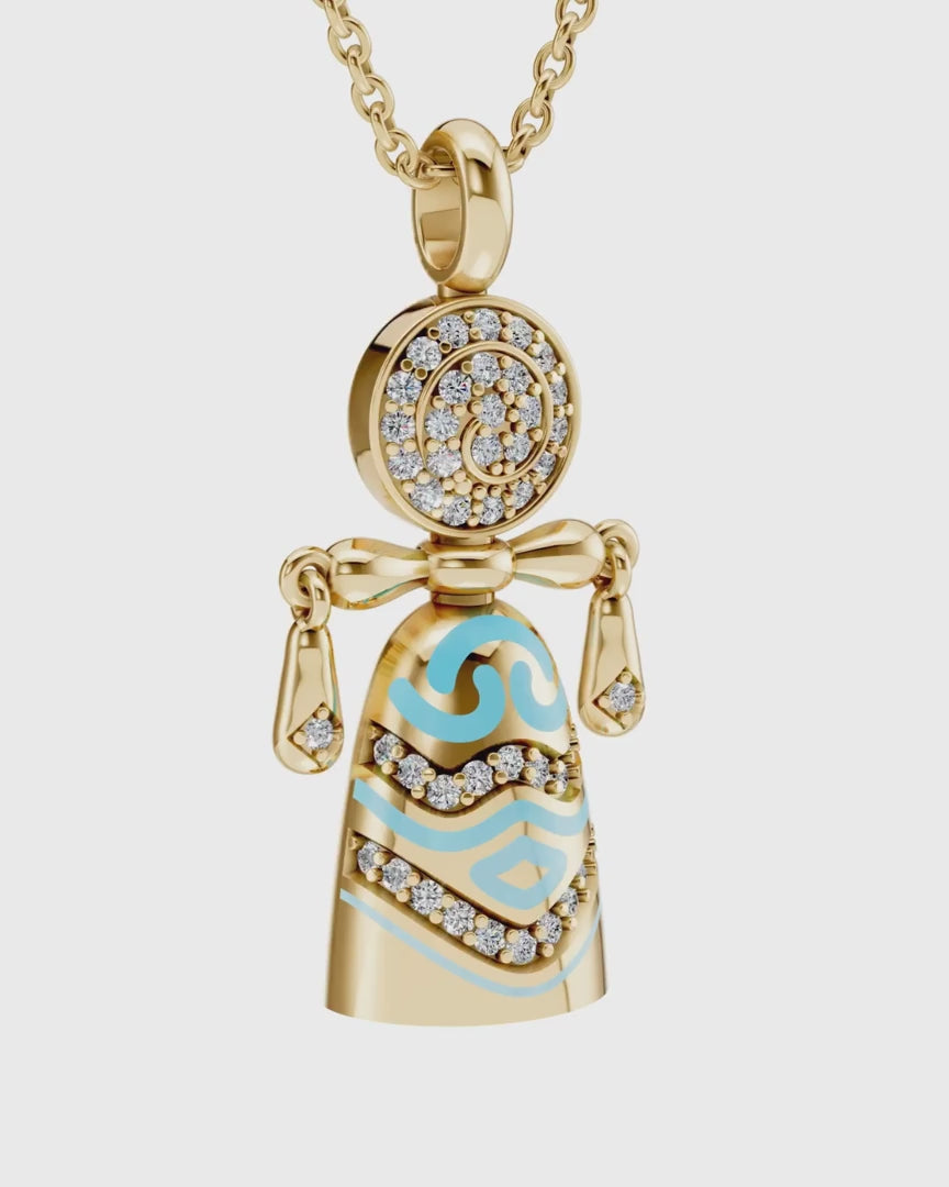 Підвіска лялька-мотанка "Кольори роду" — це прикраса, яка втілює глибинний зв’язок між поколіннями та спадщиною вашого роду. Виготовлена з золота 585 проби, інкрустована діамантами та ювелірною емаллю, ця підвіска є символом родинної сили та мудрості, що передається через покоління.