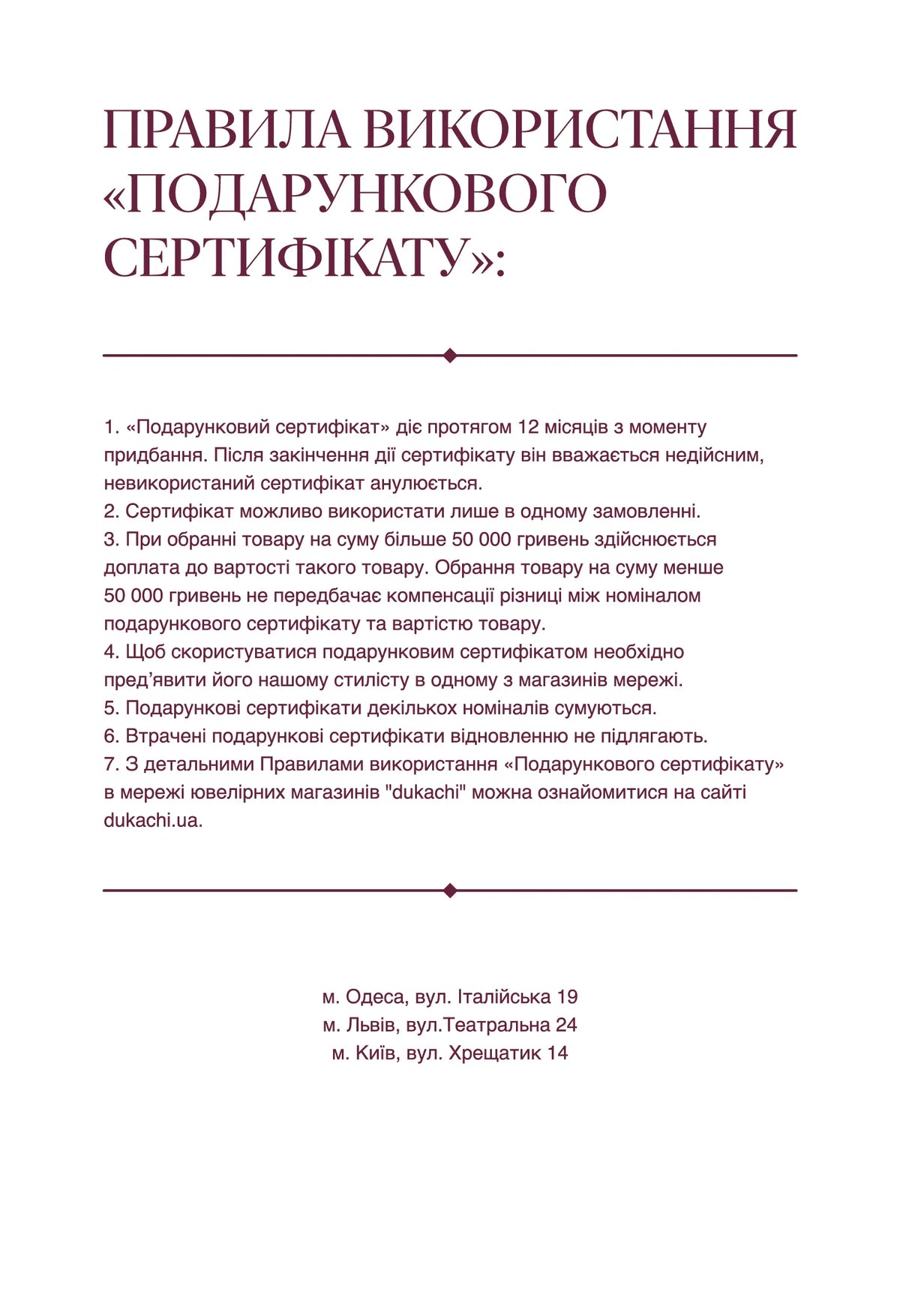 7.З детальними Правилами використання «Подарункового сертифікату» в мережі ювелірних магазинів «dukachi» можна ознайомитись на сайті dukachi.ua.