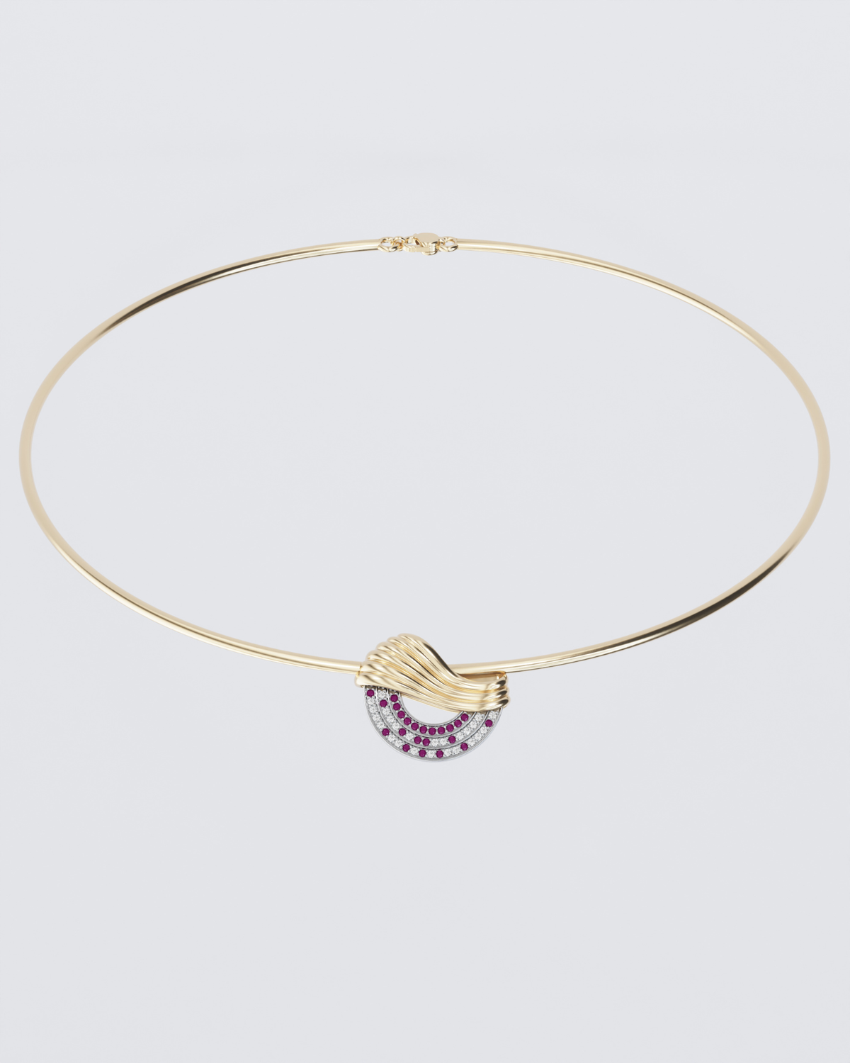 Колекція Марія присвячена Марії Заньковецькій - знаковій постаті українського театру 19-20 століття. Колекція фіксує саму мить її появи на сцені - момент, коли вона стоїть перед залом, а глядачі зібралися, щоб побачити й почути її. Форма прикрас відтворює композицію залу Львівського Театру Марії Заньковецької - його просторову логіку та сценічну орієнтацію. У формі виробів закладено мотив театральних завіс, з-за яких починався кожен її вихід на сцену. Каміння викладено напівколом, повторюючи форму театральних рядів. Діаманти та рубіни розміщені за принципом фактичної схеми зали: рубіни у «першому ряду» символізують найближчих до неї людей, далі червоні акценти поступово розходяться, повторюючи розміщення глядачів у залі. Прикраси виконані із золота 585 проби, інкрустована діамантами і рубінами.