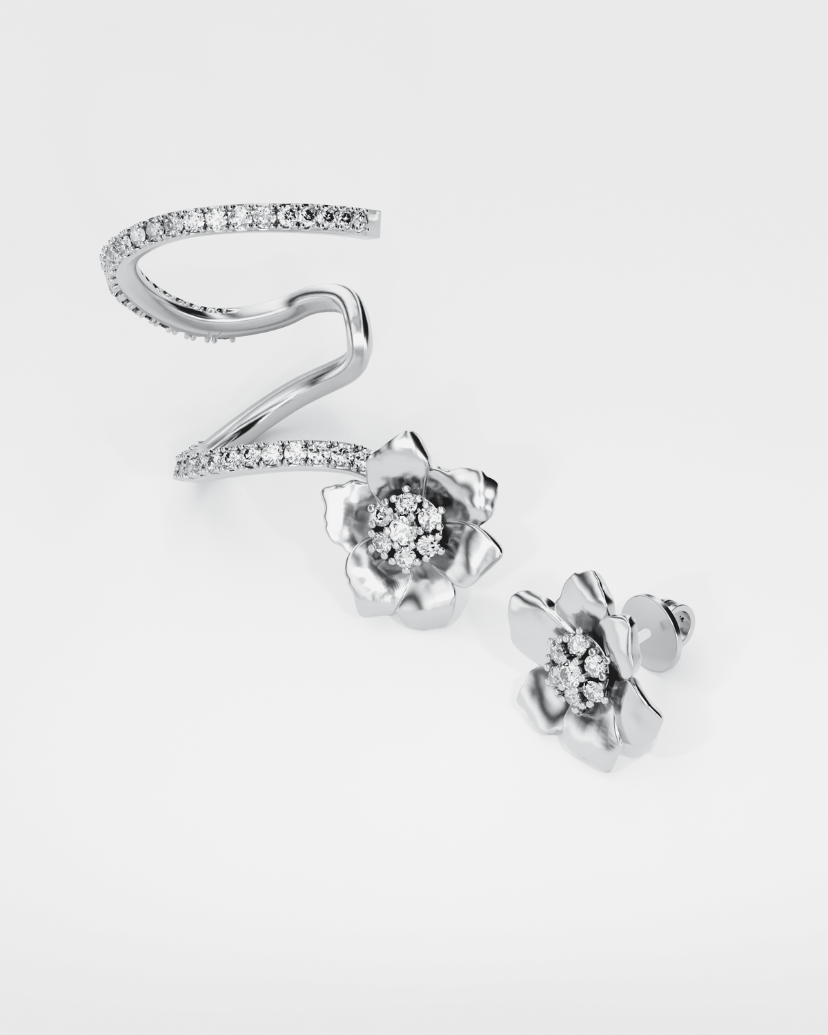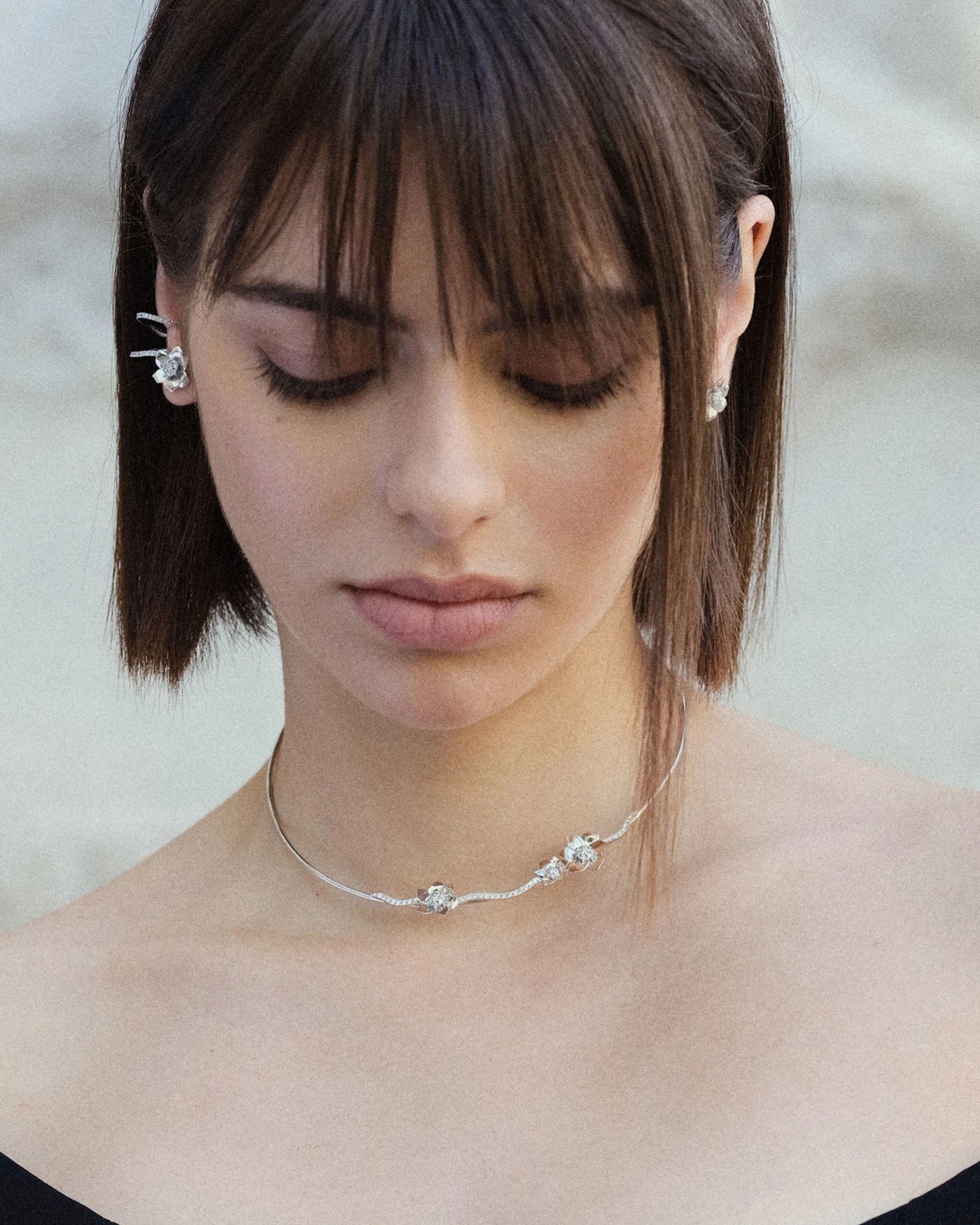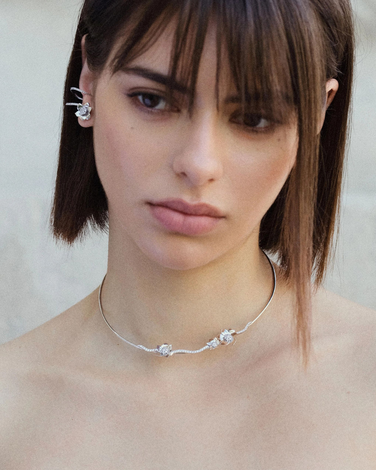 Золоті прикраси повторюють елементи вінка. У центрі — анемона, гірська квітка з Карпат, Альп і Піренеїв, яка розквітає першою після снігу. Анемона — квітка, що символізує раннє пробудження природи і поєднує тендітність з прихованою силою— образ, увічнений у мистецтві XIX століття. Діамантова лінія завершує композицію, повторюючи стрічки, якими прикрашали вінки.