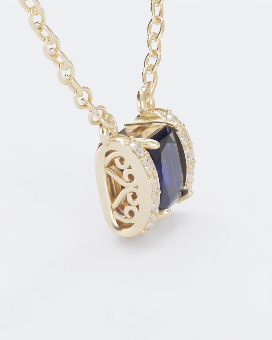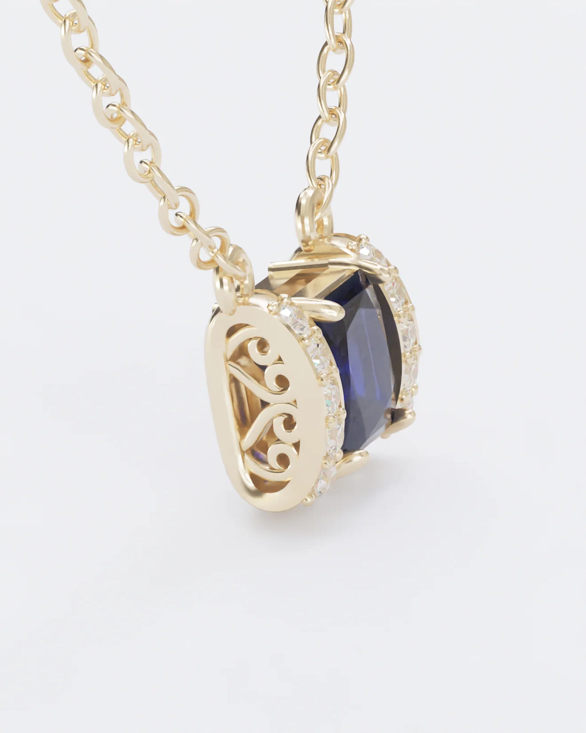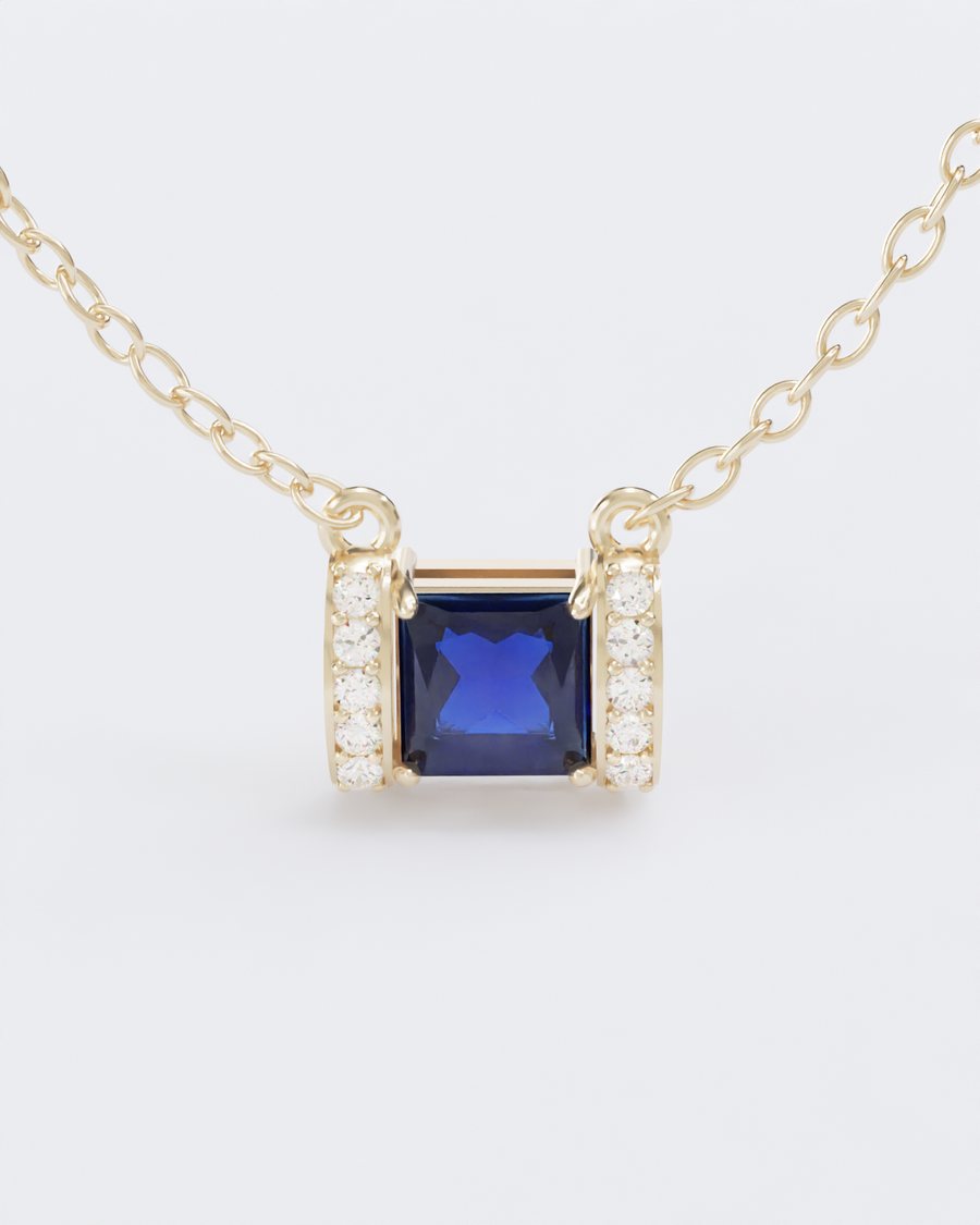 У центрі кольє вирощений сапфір, який сяє яскравим темно-синім, насиченим кольором.