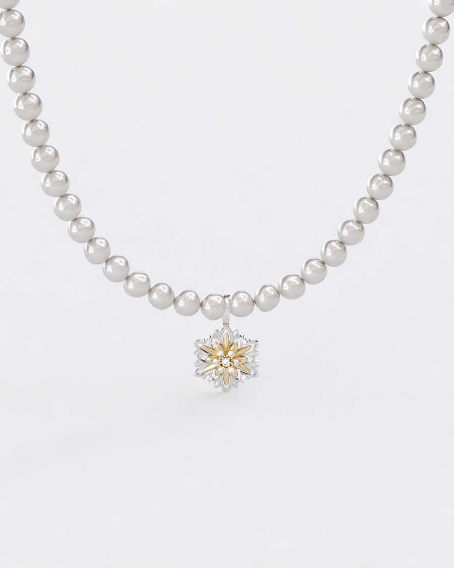 Золоте кольє Едельвейс з натуральними прісноводними перлами білого або кремового кольору. Якість перлів ААА (мають невеликі природні недоліки, що підкреслюють індивідуальність та натуральність перлів).