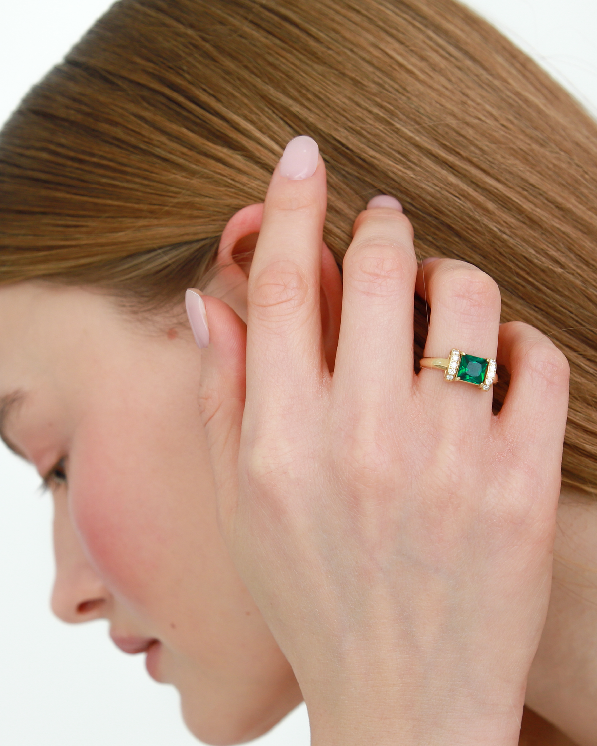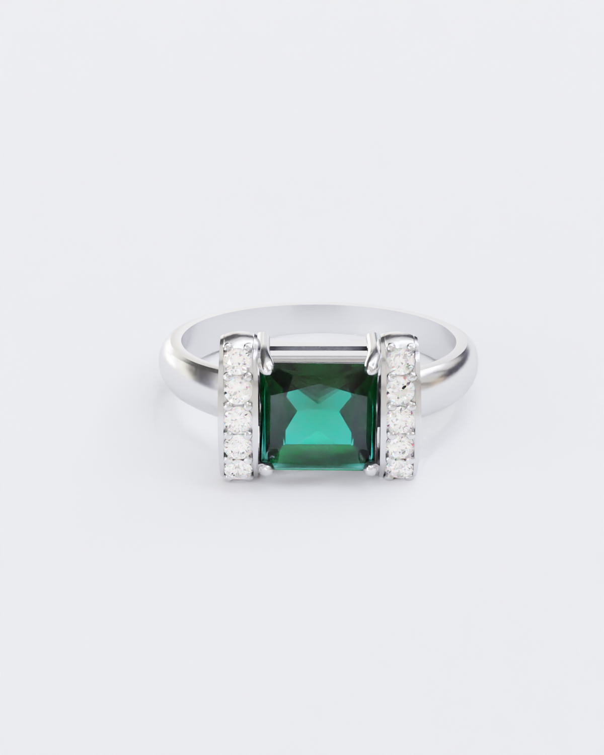 У центрі каблучки вирощений смарагд, який сяє яскравим темно-зеленим, насиченим смарагдовим кольором.