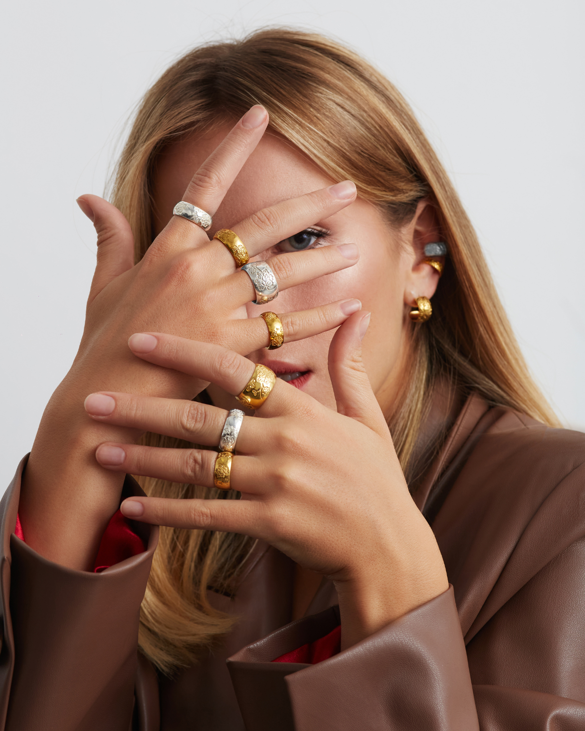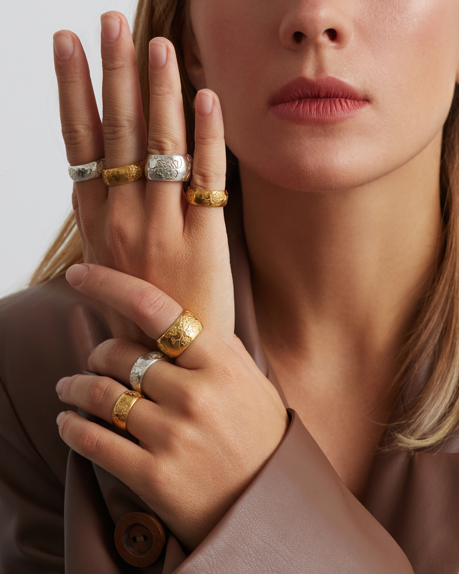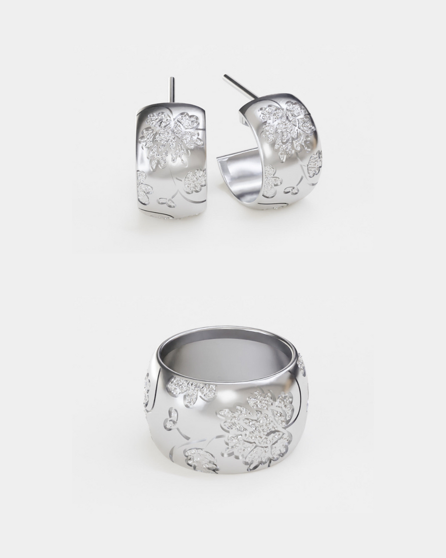 Сережки та каблучка з колекції Bloom — оригінальна прикраса з візерунками дубового листочка з української вишивки. Символ життєвої сили і непереможності.