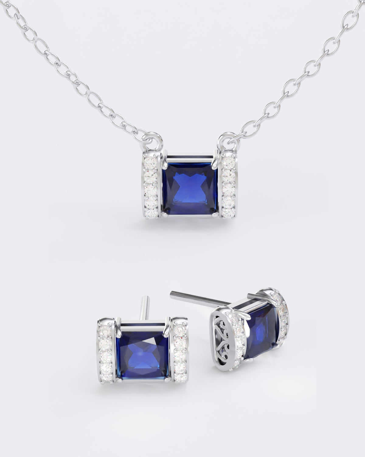 У центрі кольє вирощений сапфір, який сяє яскравим темно-синім, насиченим кольором. Бічні сторони інкрустовані лабораторними діамантами, які підсилюють блиск цього унікального виробу.