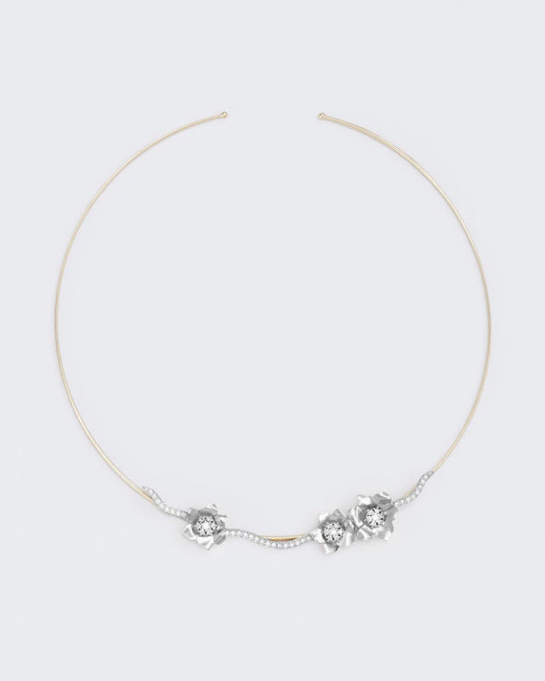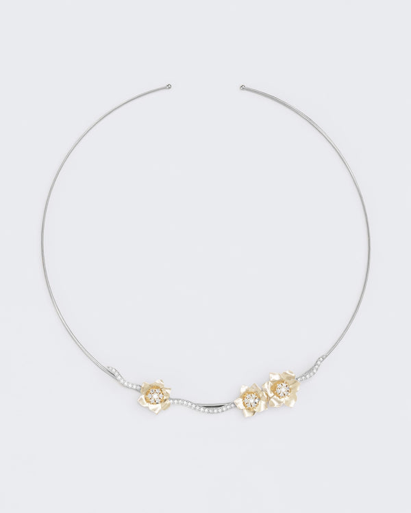 Золоте кольє повторює форму вінка як прикраси, що позначає урочистий момент.